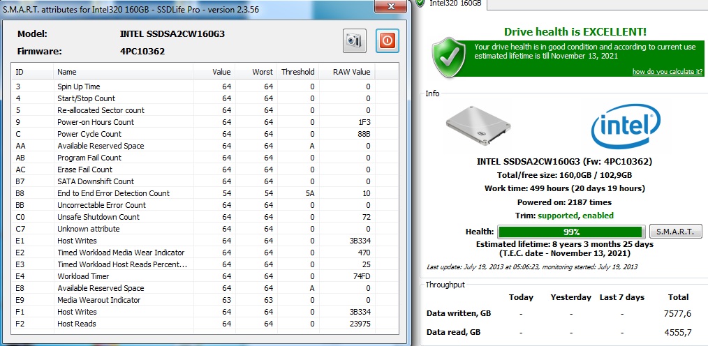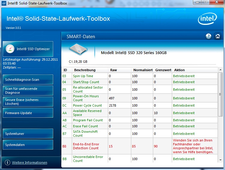 meine Intel SSD 320 160GB vom April 2011(5 Jahre Garantie) hat seit ein paar Tagen einen SMART-Fehler, genauer "End-to-End Error Detection Count".