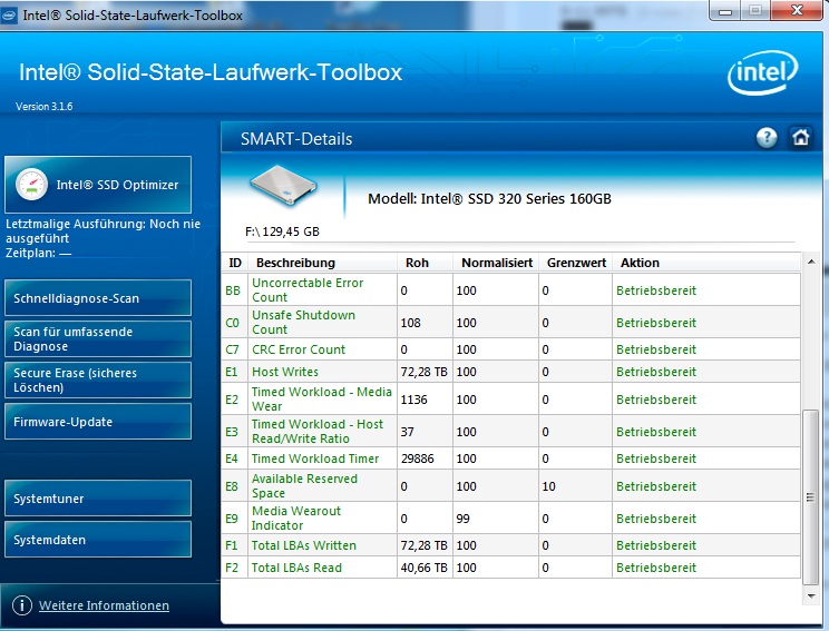 Falls ich aber keinen Erfolg habe, werde ich wohl eine RMA an Intel durchführen müssen. Jedoch gibt Intel nur Garantie bei max. 20GB Write pro Tag.