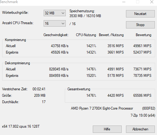 Richtig, daran hatte ich nicht gedacht und der Vollständigkeit liefere ich dann noch, für den antiken 2700X, den entsprechenden Benchmark nach.GrumpyCat schrieb:Nur so am Rande, Crypto und Compression sind zwei völlig unterschiedliche Paar Schuhe. Crypto hat z.B. gar keine nennenswerten Datenfenster, auf die der Algorithmus zugreifen muss, während Kompression teilweise mehrere MB Working Set hat. Und CPUs mögen AES-spezifische Befehle haben, aber z.B. bzip2-spezifische Befehle haben sie nicht.