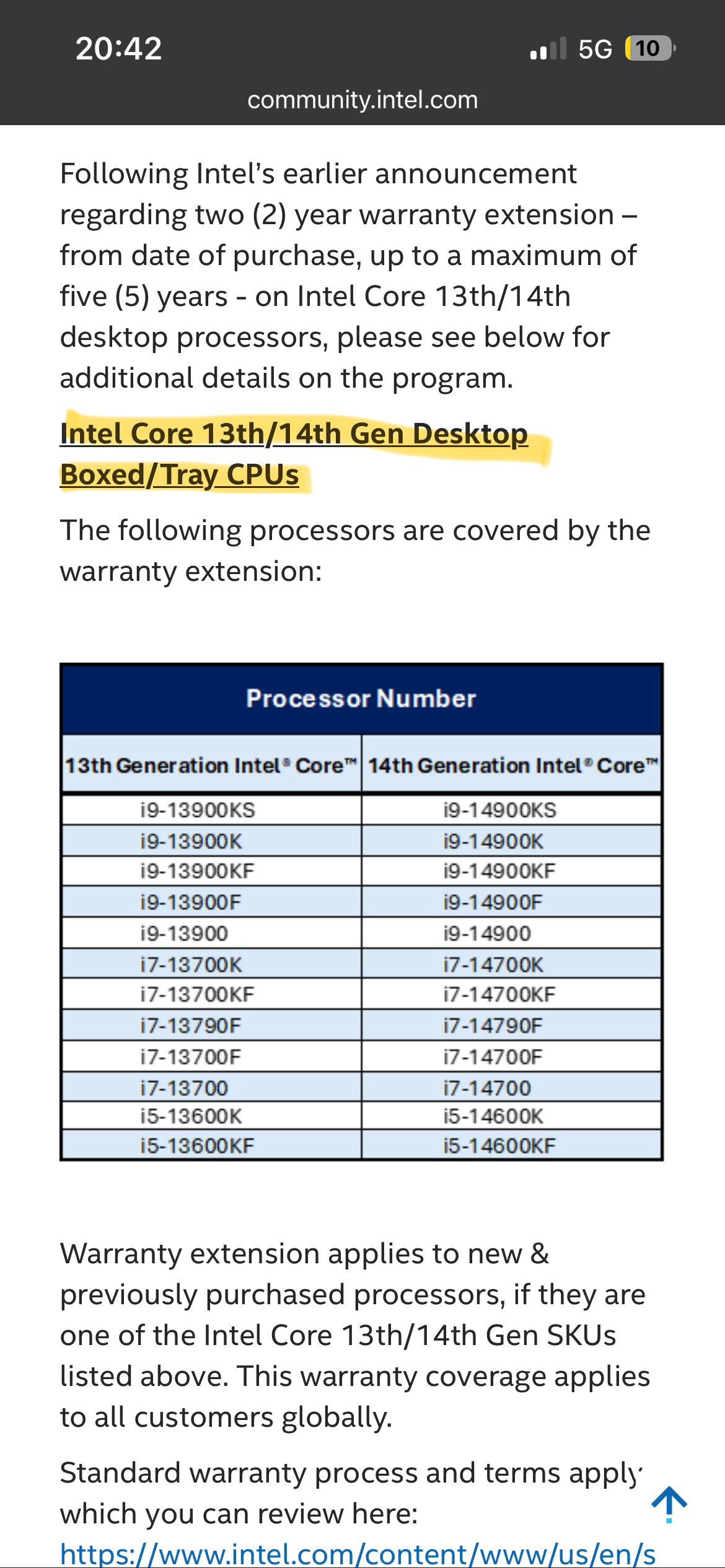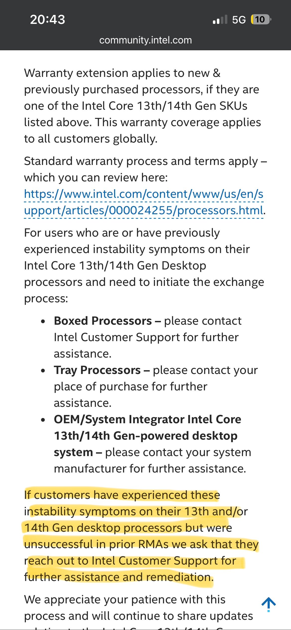 Weiter unten regelt das Dokument genau meinen Fall (wenn Händler nach 2 Jahren ablehnen):"If customers have experienced these instability symptoms on their 13th and/or 14th Gen desktop processors but were unsuccessful in prior RMAs we ask that they reach out to Intel Customer Support for further assistance and remediation."