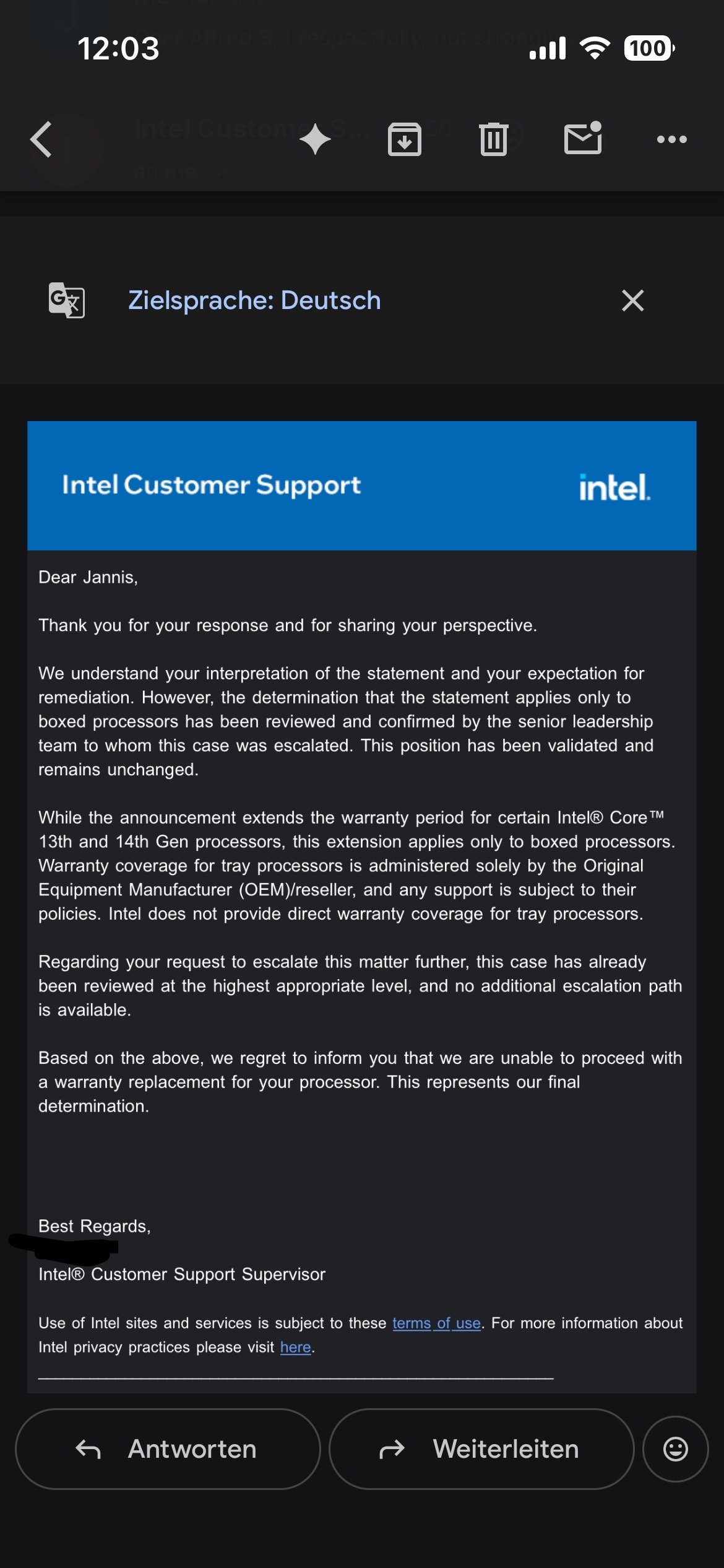 Ist das die Art und Weise, wie Intel heutzutage mit Kunden umgeht? Habt ihr ähnliche Erfahrungen mit der RMA von Tray-CPUs gemacht? Oder hat irgendwer Tipps, wie ich jetzt weiter vorgehen kann? Vielleicht habe ich auch was falsch verstanden. Kenne mich leider nicht so gut aus.
