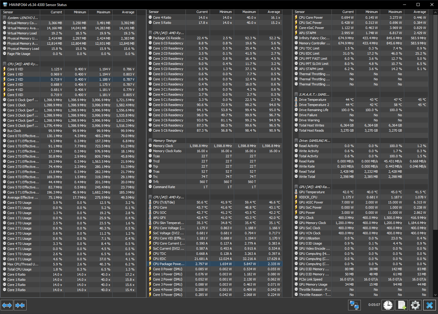 Hier mal die Werte von einem Mobilen Ryzen 4600u (1,654W). Deine CPU sollte wenn alle C-States greifen weniger als 10 W brauchen.