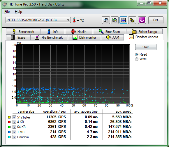 Ich habe eben noch mal die Platte einmal koplett beschrieben und den Random Access Read Test von HD Tune durchführen lassen, um zu schauen, was im "schlechtesten" Fall rauskommt. Heraus kam das hier: