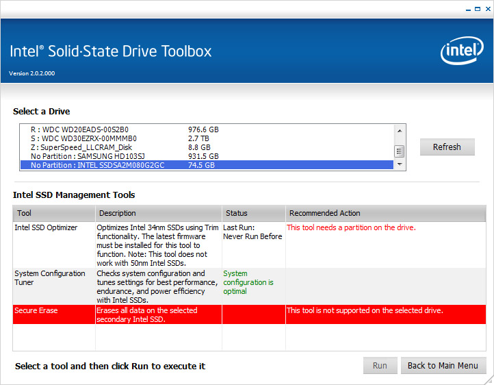 Ich habe meine Intel X25-M G2 80GB mit Sharkoon Quickport via eSATA am System angeschlossen. Wenn ich die Intel Toolbox 2.02 starte, kann ich Secure Erase nicht ausführen. Das Tool meldet "This Tool is not supported on the selected device" (siehe Anhang).