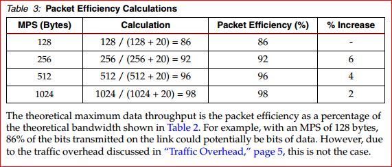 Diesen Overhead den du mit 20-25% angegeben hast ist ein Worst-Case Szenario und nciht das was PCIe 3.0 An Overhead hat. Wenn nur 128 byte Daten übertragen werden anstatt der maximalen 4096 byte pro Paket, dann ist es klar dass es einen schlechteren Overhead-Faktor gibt. Doch das ist ja nicht die Maximal mögliche Datenrate, sondern lediglich die Effizienz bei niedriger oder mittlerer Auslastung. Die Effizienz bei 1024 byte Paketen liegt schon bei 98% wie in deiner Quelle zu lesen ist:Although the PCI Express specification allows for payloads of up to 4,096 bytes, the specification says: “Software must take care to ensure that each packet does not exceed the Max_Payload_Size parameter of any system element along the packet’s path.” This means that every device in the hierarchy must use the same MPS setting, and the setting must not exceed the capability of any device within the hierarchy. Therefore, devices with high MPS capability are required to operate at lower MPS settings to accommodate the device with the lowest MPS capability. For example, the MPS of the PCI Express system in Figure 7 is programmed to 128 bytes to accommodate