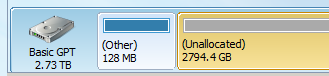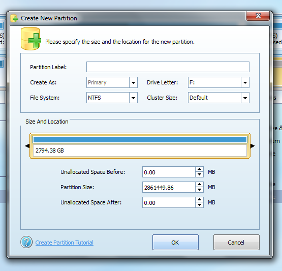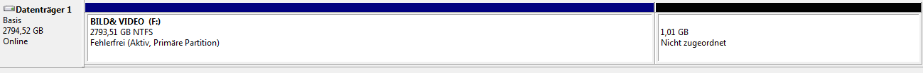 Wie SilenceIsGolden schon geschrieben hat, verweigert die Datenträgerverwaltung von Windows ab Vista prinzipiell das Erstellen von Partitionen mit mehr als 2,2 TB, wenn MBR als Partitionsstil bei der Initialisierung der Platte ausgewählt wurde, selbst wenn die logische Sektorgröße mehr als 512 Bytes beträgt. Das kann man nur durch Tools von Drittherstellern umgehen. Das ist aber immer abhängig von der logischen Sektorgröße des Datenträgers. Bei einer logischen Sektorgröße von 512 Bytes beschränkt der MBR die maximale Partitionsgröße (faktisch im Grunde auch die maximal verwaltbare Festplattenkapazität) immer auf 2,2 TB. Daran kannst du mit keinem Tool der Welt was ändern.