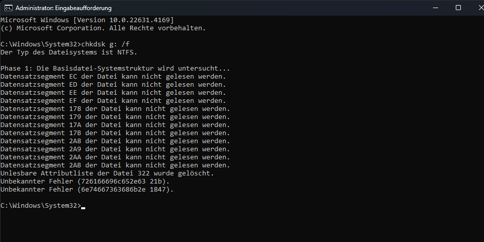 Also, CMD geöffnet, und mit CHKDSK und der Aktion f begonnen, die SSD auszulesen, aber seht selbst was im Bild steht.
