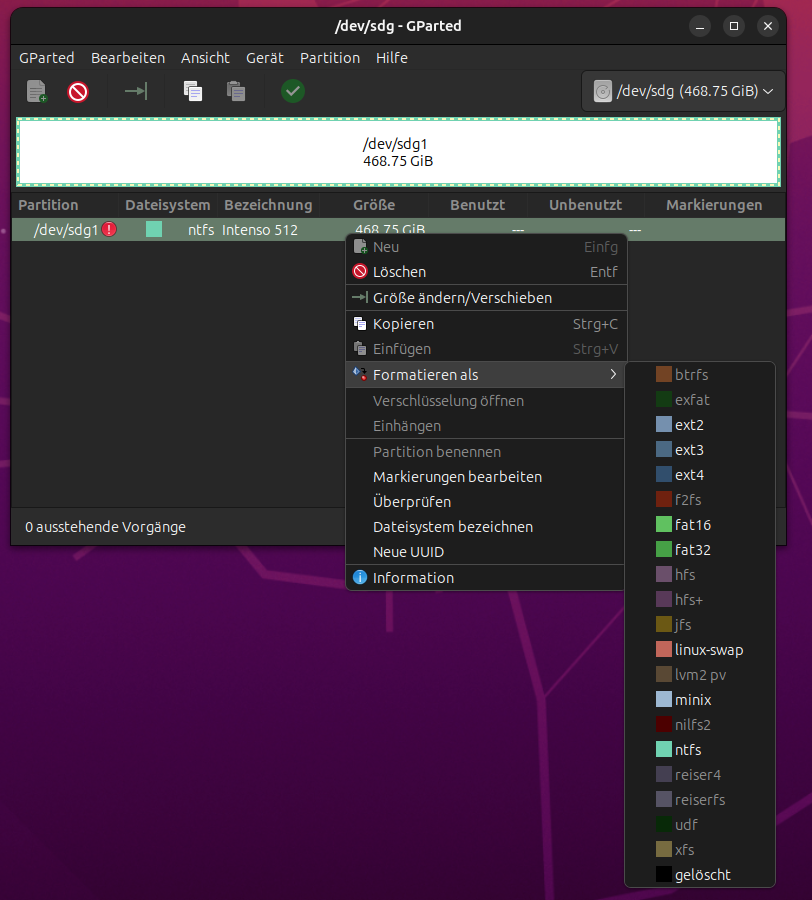 Mit GParted kann ich ihn ja wieder problemlos mit exFAT formatieren.