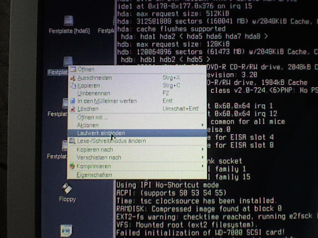 Du müßtest jetzt Icons auf dem Desktop mit den Bezeichnungen hda1 und hdb1 haben, hda1 ist die Disk mit den Fehlern, diese müßtest Du via Menü des Icons hda1 einbinden: