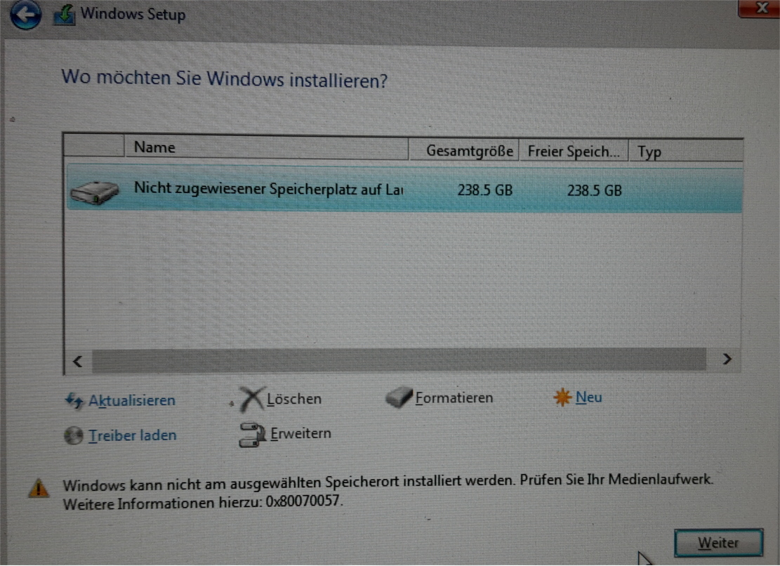 Habe den Fehlercode gegoogelt, jedoch brachten die Tipps (Festplatte vorher partionieren) auch keinen Erfolg.Eine Partition auf dem Datenträger "0" konnte nicht formatiert werden. Der Fehler ist beim Vorbereiten der für die Installation ausgewählte Partition aufgetreten. Fehlercode: 0x80070057