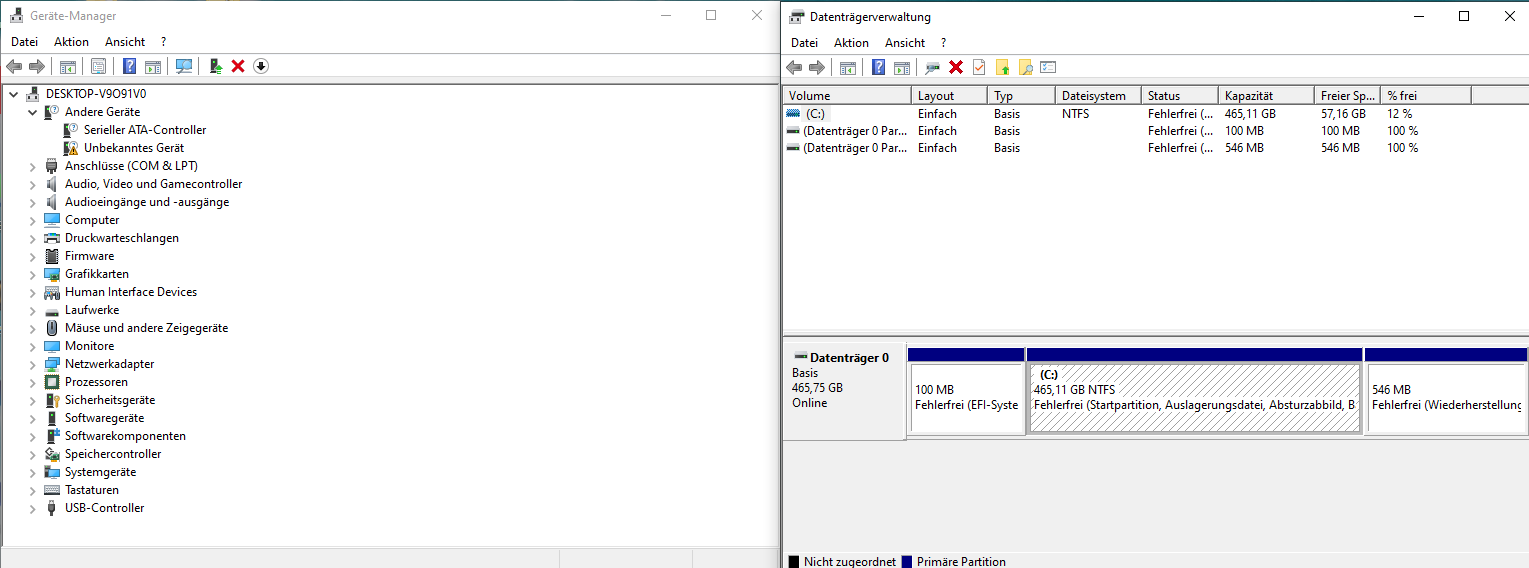 Ich vermute das Problem hängt damit zusammen, dass im Geräte-Manager oben unter "Andere Geräte" ein unbekanntes Gerät ist und der Serielle ATA-Controller, der normalerweise unter dem Reiter "IDE ATA/ATAPI-Controller" zu finden sein sollte. Der Reiter fehlt bei mir jedoch komplett. Auch im BIOS habe ich hierzu nichts gefunden.