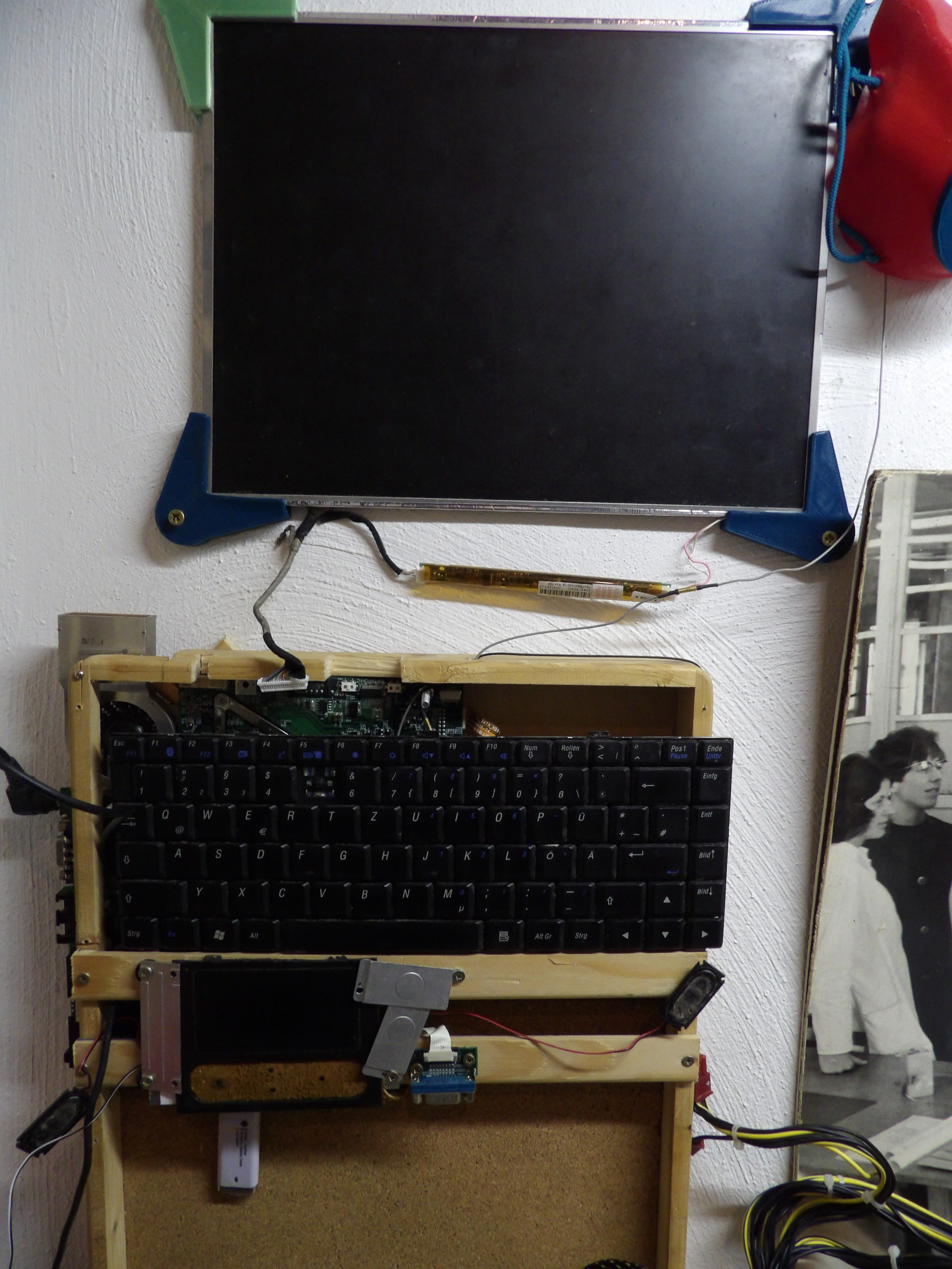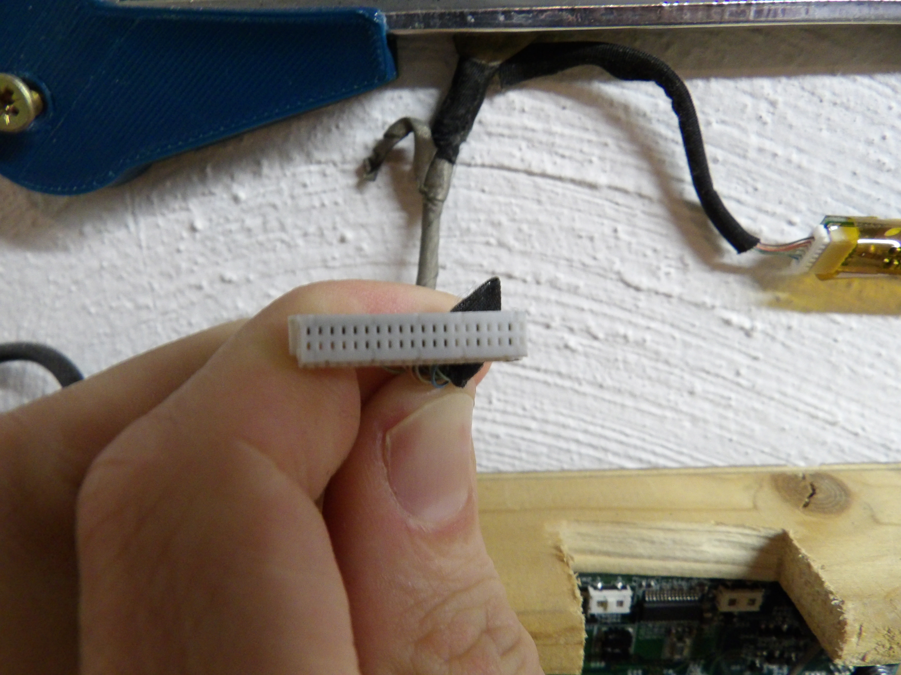 ich hatte in meiner Werkstatt ein altes Notebook "an die Wand genagelt" und mit Linux als "Browser" für den Bastelalltag betrieben. Es handelte sich um ein TAROX Lightpad aus Mitte der 2000er Jahre, genauere Angaben habe ich nicht mehr. Vor kurzem hat es denn Geist aufgegeben und ich würde es gerne ersetzen. Mit dem noch funktionstüchtigen Bildschirm-Display bin ich soweit zufrieden, die Frage ist, lässt sich dieses durch andere Hardware ansteuern? Auf den Fotos seht ihr die Steckverbindung, die aufs Mainboard führt. Dort ist diese nicht weiter beschriftet bis auf die Angabe "Com 01". wobei ich die Zahl aufgrund einer halb darüberliegenden Schraube nur erahnen kann. Am Bildschirm selbst hängt auch noch eine schmaler langer Controller(?)