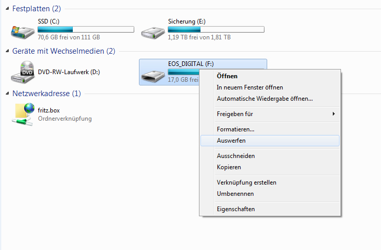 Wenn ich eine SD Karte über den Arbeitsplatz auswerfe ist alles gut: