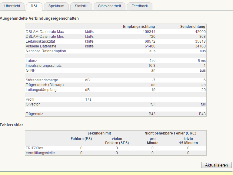 Ok lief jetzt über 1 Stunde gut mit alter Firmware aber jetzt wieder Resync . Hab dann eben in der Fritzbox geguckt und dann war das zu sehen. Man achte auf die Störabstandsmarge -7 wtf. Habe den Regler auch auf Max Stabilität.