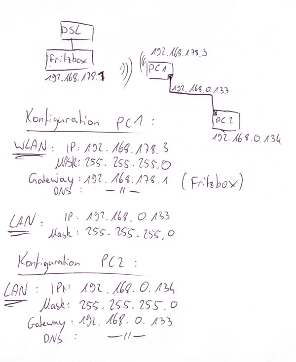 PC1 und PC2 verfügen über normale Lankarten (Onboard). PC2 ist mit PC1 über Lankabel verbunden, PC1 gleichzeitig über WLan mit dem Internet (Router).