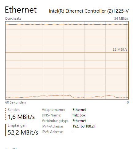 Ich habe laut Internetvertrag eine Bandbreite von 50 Mbit/s. Jetzt ist mein Problem gar nicht das mein Computer nicht die "vollen" Bandbreit erhält, sondern mein Problem ist das er diese Bandbreite nicht verwendet. Wen ich in den Task-Manager aufrufe und nachsehe wie viel Computer unter Last theoretisch erhält liegt dies bei ca. 45-52 Mbit/s. Jedoch verwendet mein Computer nur zwischen ca. 5,5 und 7 Mbit/s. Dies entnehme ich z.b. der Downloadgeschwindigkeit bei Stream.