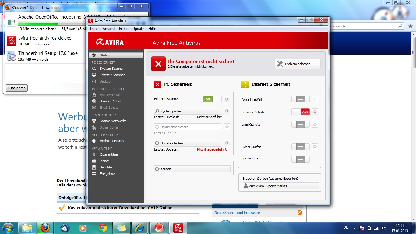 gestern habe ich meinen laptop abgeholt. er hatte die HDD kaputt und nun hab ich dort eine neue und Win7 Home wieder drauf installiert. Dann wollte ich meinen PC wieder normal einrichten mit Firefox, Thunderbird etc. Dies hat alles geklappt.