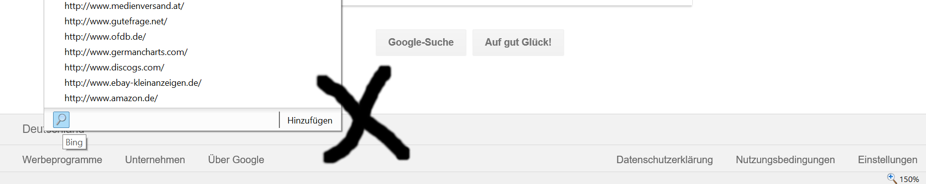 Wie bekomme ich das wieder weg ? Wenn ich übe Add-Ons verwalten - Suchanbieter - Bing deaktivieren gehe, passiert nichts, Bing war schon deaktiviert und diese Suchleiste/Suchfeld bleibt trotzdem