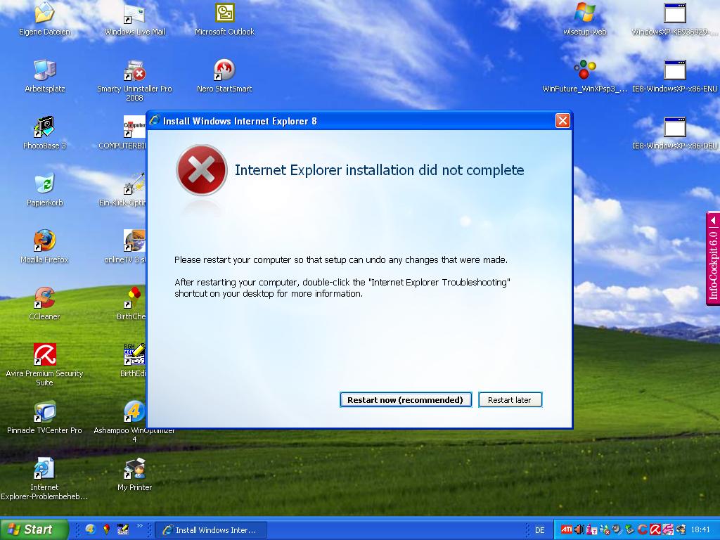 Mein Opa kann auf seinem PC den IE 7 nicht installieren, er hat noch den IE 6 drauf und wollte den 7er installieren, doch während der Installation kommt die im Anhang auftretende Fehlermeldung! Jetzt hat er mich gebeten hier mal nachzufragen woran das liegen könnte. Ich habe auch schon etliche Versuche gestartet (Systemwiederherstellung, dann habe ich versucht den IE 7 über das WinFuture Update Pack XP SP3 v3.06 – November 2008 zu installieren -> ging auch nicht!)