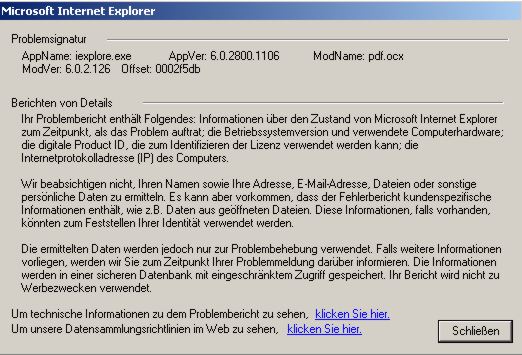 Wenn ich auf einer Seite eine Adobe Reader Datei öffne (Acrobat Reader Datei) öffnet sich das Adobe Programm. Alles wird so angezeigt wie es sein sollte. Sobald ich jetzt aber den IE dann schließe oder eine andere Seite aufrufe hängt er sich und es erscheind die Standard Meldung ob ich den Problembericht senden will oder nicht.