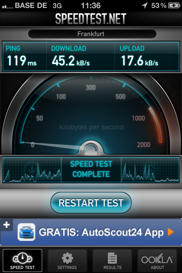 Übrigens: messen kannst du unter speedtest.net ... ich weiss aber nicht, ob das nicht eine Seite mit Flash ist, dann hast mit dem iPhone ganz schlechte Karten