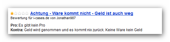 Alles was ich geschrieben habe, stimmt. Ich denke mir nichts davon aus. Das sind meine eigenen Erfahrungen mit diesem Shop und ich habe auch nicht behauptet, dass ich seit Wochen auf mein Geld warten würde oder sowas. Ich gebe natürlich zu, dass meine Formulierungen meiner Bewertung ein bisschen scharf sind.