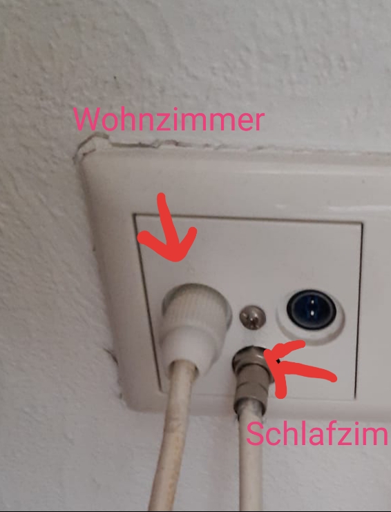 Im Wohnzimmer ist die Multimediadose. Dort ist an der TV-Buchse das Kabel für den Wohnzimmerfernseher, während an der SAT-Buchse das Kabel zum Schlafzimmer-Fetnseher führt. Siehe Foto.