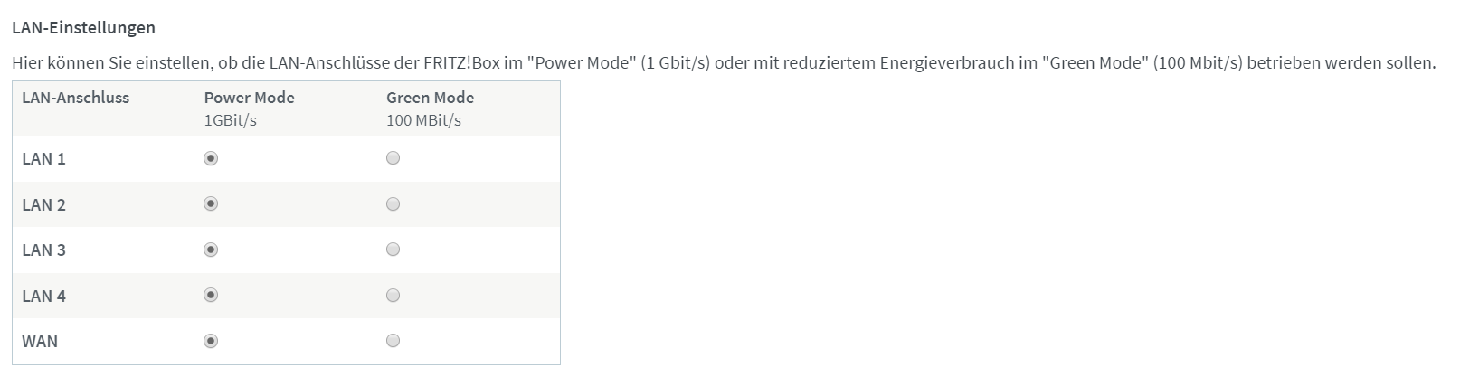 3.1 LAN-Einstellung der Fritzbox auf Power Mode überprüft (war zu vor schon aktiv. Einmal verändern und Übernehmen hat nichts gebracht)