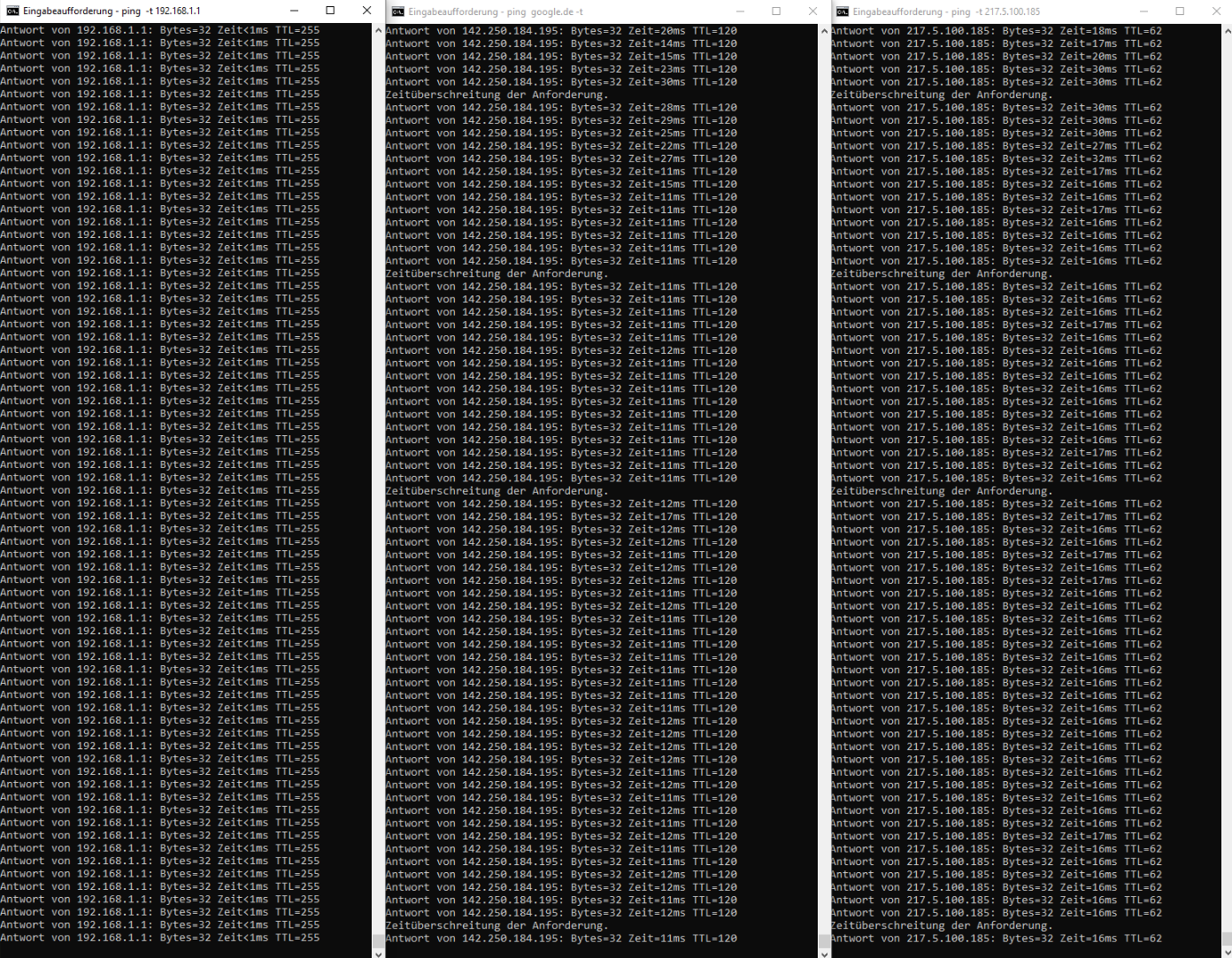 wenn ich 8.8.8.8 anpinge oder einen Telekom-Server, dann habe ich fast immer gleichzeitig Paketverluste. Parallel pinge ich meinen Router an - dort keine Paketverluste. Wobei ich einmal auch dort Paketverluste hatte. Aber das wie absolute Ausnahme.