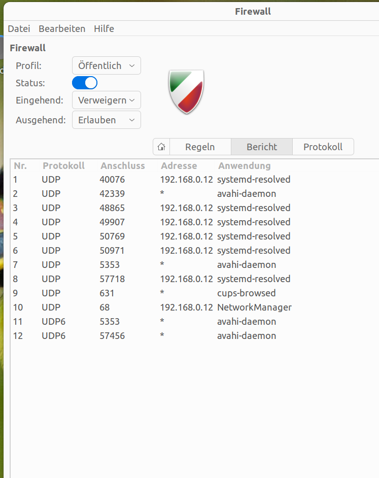 Ich habe hier einen Screenshot vom Lauschbericht der gufw während das Internet langsam ist. Es wurden von mir keine Regeln erstellt, ich nutze gufw nur manchmal, um zu sehen welche Ports geöffnet sind. Mich wundert, dass hier nichts von Firefox angeführt ist, aber einiges von "systemd-resolved", obwohl währenddessen YT-Videos geöffnet sind.