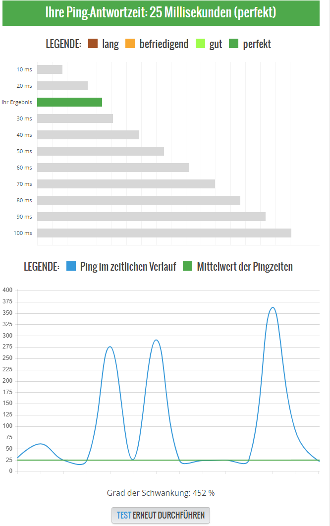 Ich habe oftmals Probleme mit dem Internet. Die letzten Tage war alles in Ordnung aber heute sehr extrem. Es ist aber nur der Ping, bzw. die Schwankung betroffen. Down- und Upload sind immer konstant. Spiele und weiteres Twitch etc laufen einwandfrei, bei Discord jedoch höre ich meine Kollegen so, als würde halt die Internetverbindung schwach werden und dadurch schlechte Soundqualität übertragen werden.