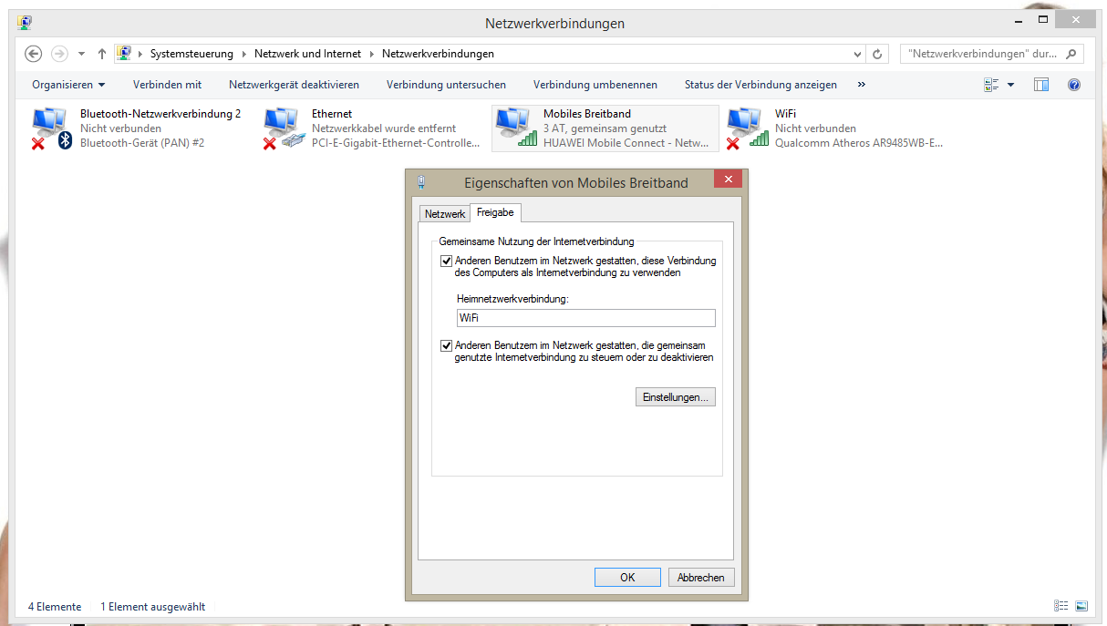 Also ich hätte mir nicht gedacht das es so kompliziert sein kann das Internet vom Notebook wo ein UMTS Stick angeschlossen ist dieses auch für das Handy nutzbar zu machen. Habe Tools wie VirtualRouter probiert aber außer das sie mein Netzwerk komplett lahm gelegt haben hat sich nichts getan. Ich verwende am Notebook Windows 8.1 Pro mit Update 1 und am Handy habe ich Android. Ich schaffe es einfach nicht das ich Internet am Handy über denn Stick bekomme bzw über das Wlan vom Notebook. VirtualRouter erkennt nicht mal denn Wifi Chip von daher scheidet es eh schon aus und beim Deinstallieren hat mir das Teil auch gleich das gesamte Netzwerk geschrottet so das nur eine Backup wiederherstellen geholfen hat. Ich könnte mir zwar einen Mobilen Router kaufen nur das muss doch so auch gehen, dachte heute wäre alles so einfach aber ich bekomme das nicht hin und ich bin eigentlich kein Laie. Jemand eine Idee wie ich jetzt am Handy das Netz vom UMTS Stick mit nutzen kann?