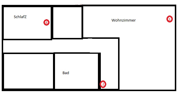 Dann jeweils einen Satelliten per Lan an Punkt 2. und 4. im 1.OG.