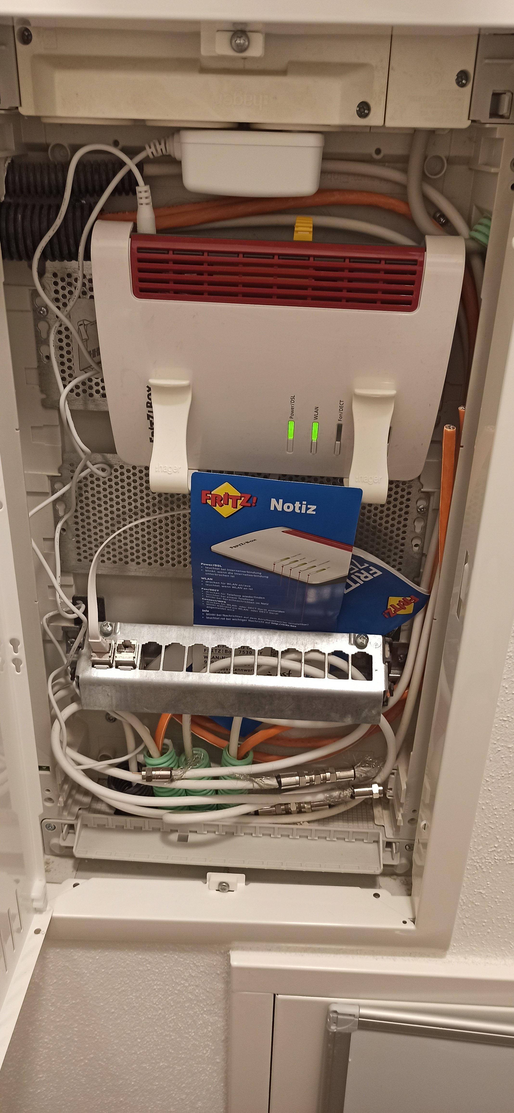 ich bin heute umgezogen in eine neue moderne Wohnung. Dort ist ein Glasfaser Anschluss mit Router bereits vorhanden. Ich hatte den Vermieter gefragt, ob ich Internet aus den Dosen bekomme, wo er ja gesagt hat. Nun bin ich beim Pc aufbauen doch etwas am Zweifeln (mir würde auch das entsprechende Kabel fehlen) anbei ein Bild von dem routeranschluss. Ich nehme an das orangene Kabel ist die Glasfaser Verbindung, welche in den router über ein Lan Kabel geht. Aber ich sehe keine weitere Verbindung die das Internet nun in die Wohnung zu den Multimedia Dosen verteilt. Sehe ich das richtig? Kann man das irgendwie so machen, oder muss ich ein Lan Kabel durch die ganze Bude zum Router verlegen?