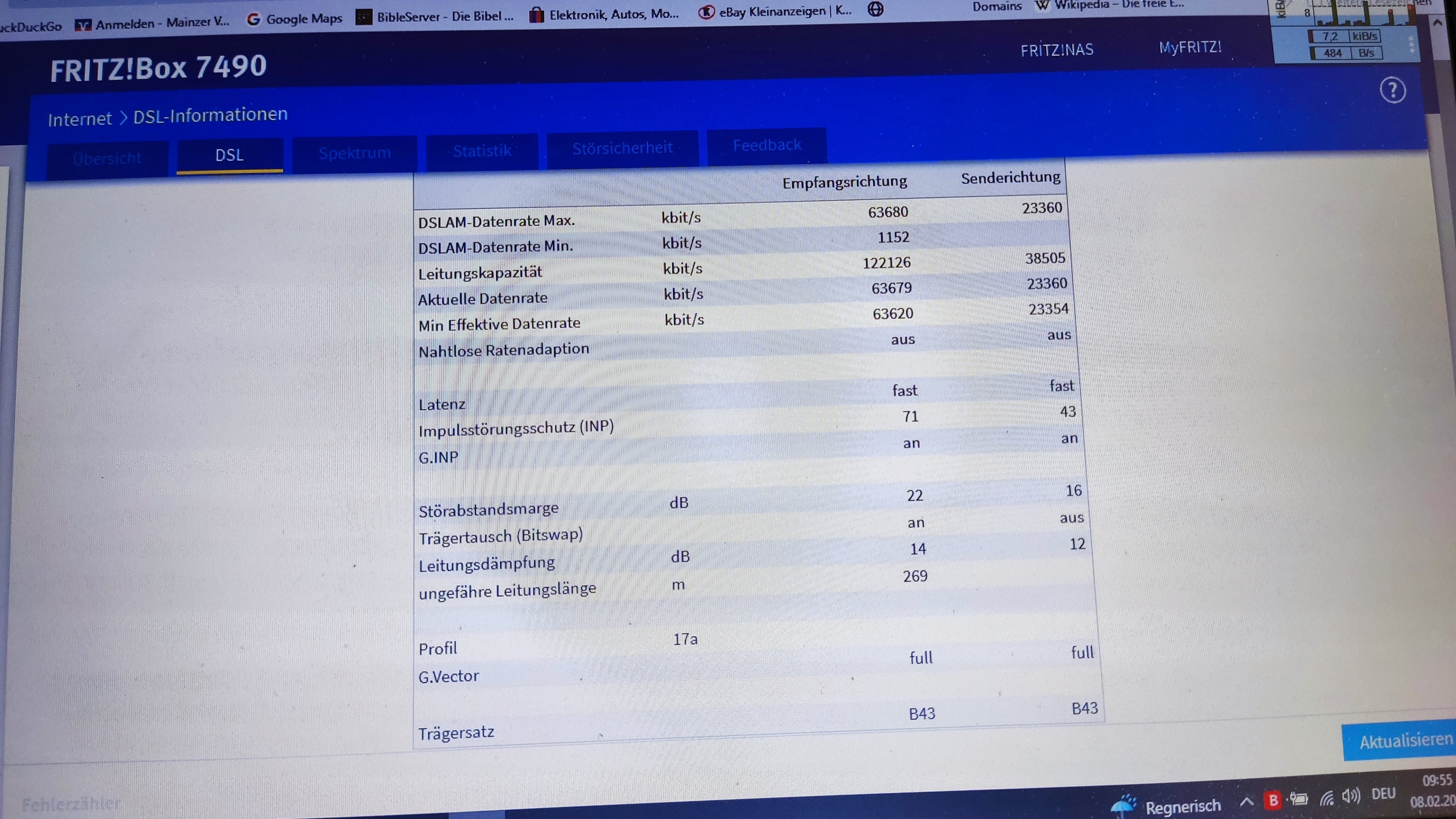 08.02.23 05:20:28 Information des Anbieters über die Geschwindigkeit des Internetzugangs (verfügbare Bitrate): 59940/21988 kbit/s