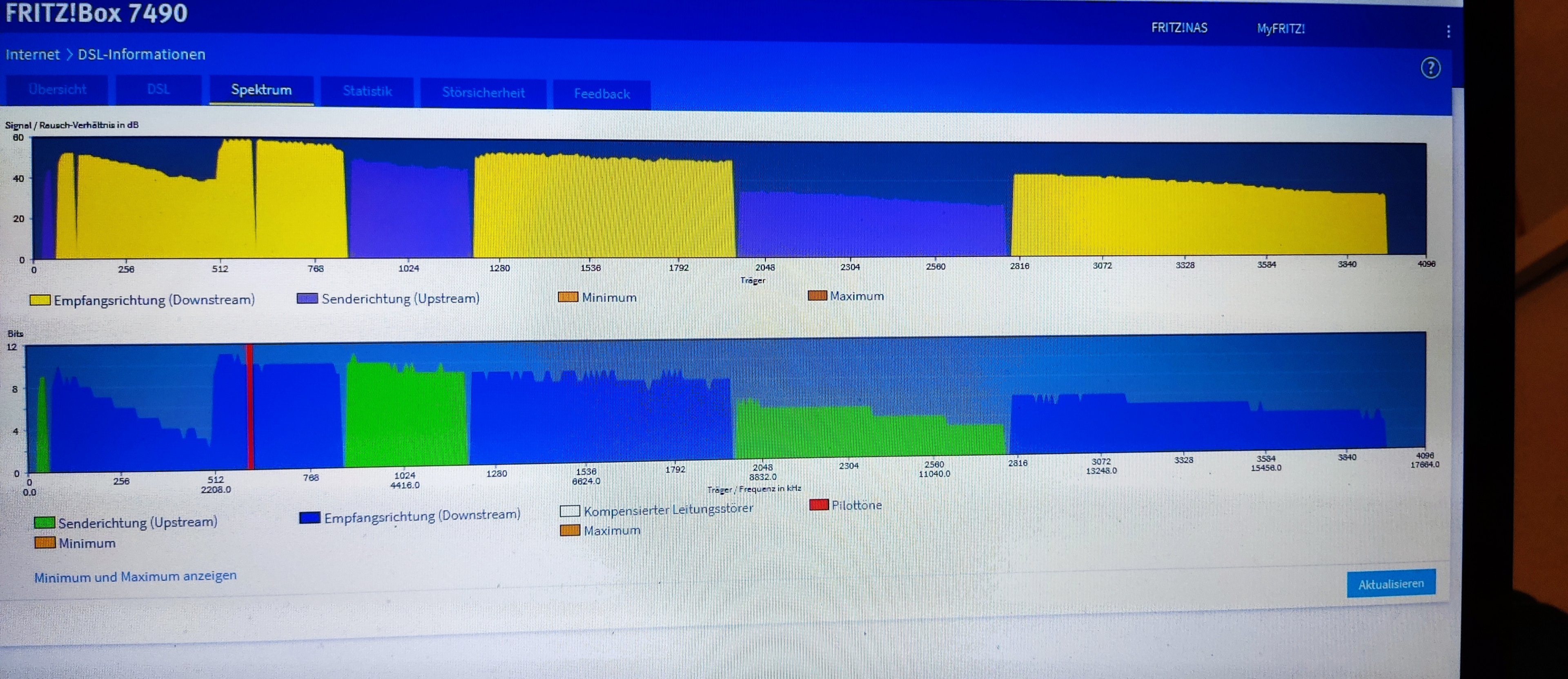 Das Spektrum sieht ok aus, wie oft kommen die Abbrüche denn noch vor? Wenn's mehrmals täglich ist, wirst du wohl auf den 63 Mbit hängen bleiben, aber bei den Leitungswerten würde ich doch eher auf starke externe Störquelle oder Wackelkontakt tippen. Besteht denn die Chance, temporär ne andere vectoringfähige Box anzuklemmen? Vielleicht hat ein bekannter ne Fritte übrig, weil er auf ne andere Technologie gewechselt ist.