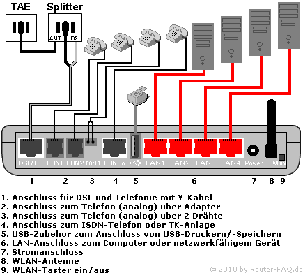 TAE-Buchse zu Splitter, Splitter mit ISDN-Box, daneben noch ein Verteiler zu Fax und zweiter Nummer.