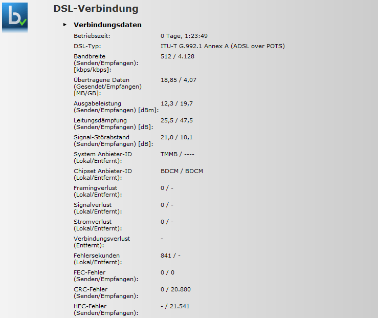 Heute habe ich den Test wiederholt. Heute war das Ergebnis deutlich besser. Ich habe sogar 18.7[Mbit/s] download, aber ebenfalls nur 0.4[Mbit/s] Upload erreicht. Nichtsdestotrotz macht das Internet häufig Probleme.