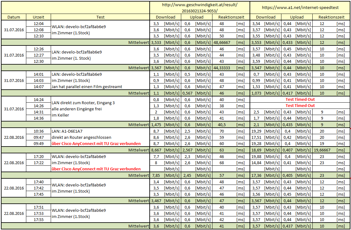 Ich möchte bei meinem Elternhaus den Internet-Anschluss modernisieren. Der Internet-Anschluss läuft über das Festnetz. Ich komme aus Österreich. Der Anbieter ist A1. Ich habe soeben die Verfügbarkeit von A1 geprüft. Laut A1 kann ich maximal 8[Mbit/s] Download Geschwindigkeit erreichen. Am 31.07.2016 habe ich einen Speed-Test durchgeführt. Ich habe den PC direkt an das Modem angeschlossen und nur 2.1[Mbit/s] Download und 0.43[Mbit/s] Upload erreicht. Ich habe dabei den Speedtest von A1 verwendet: https://www.a1.net/internet-speedtest