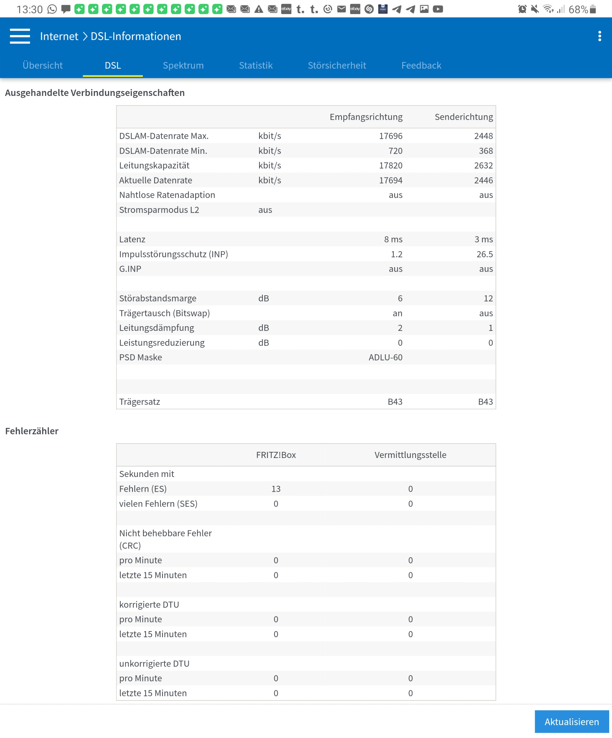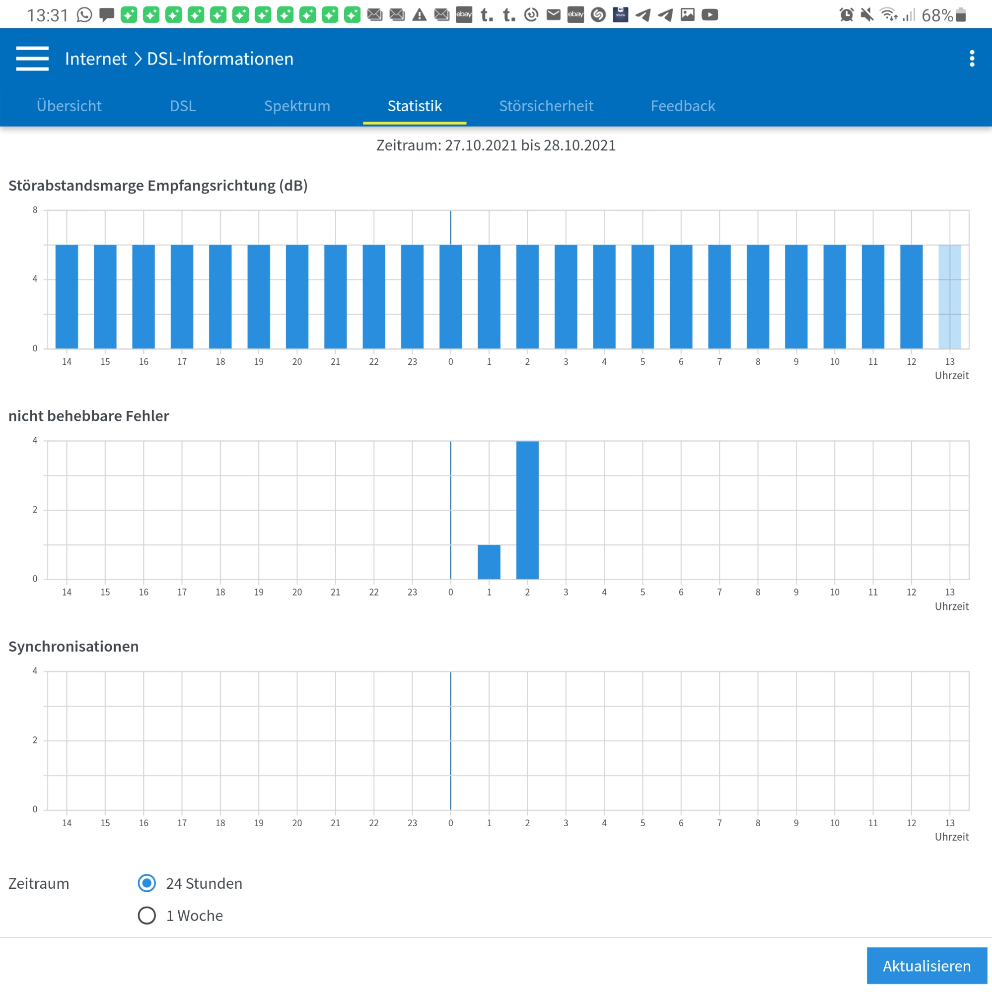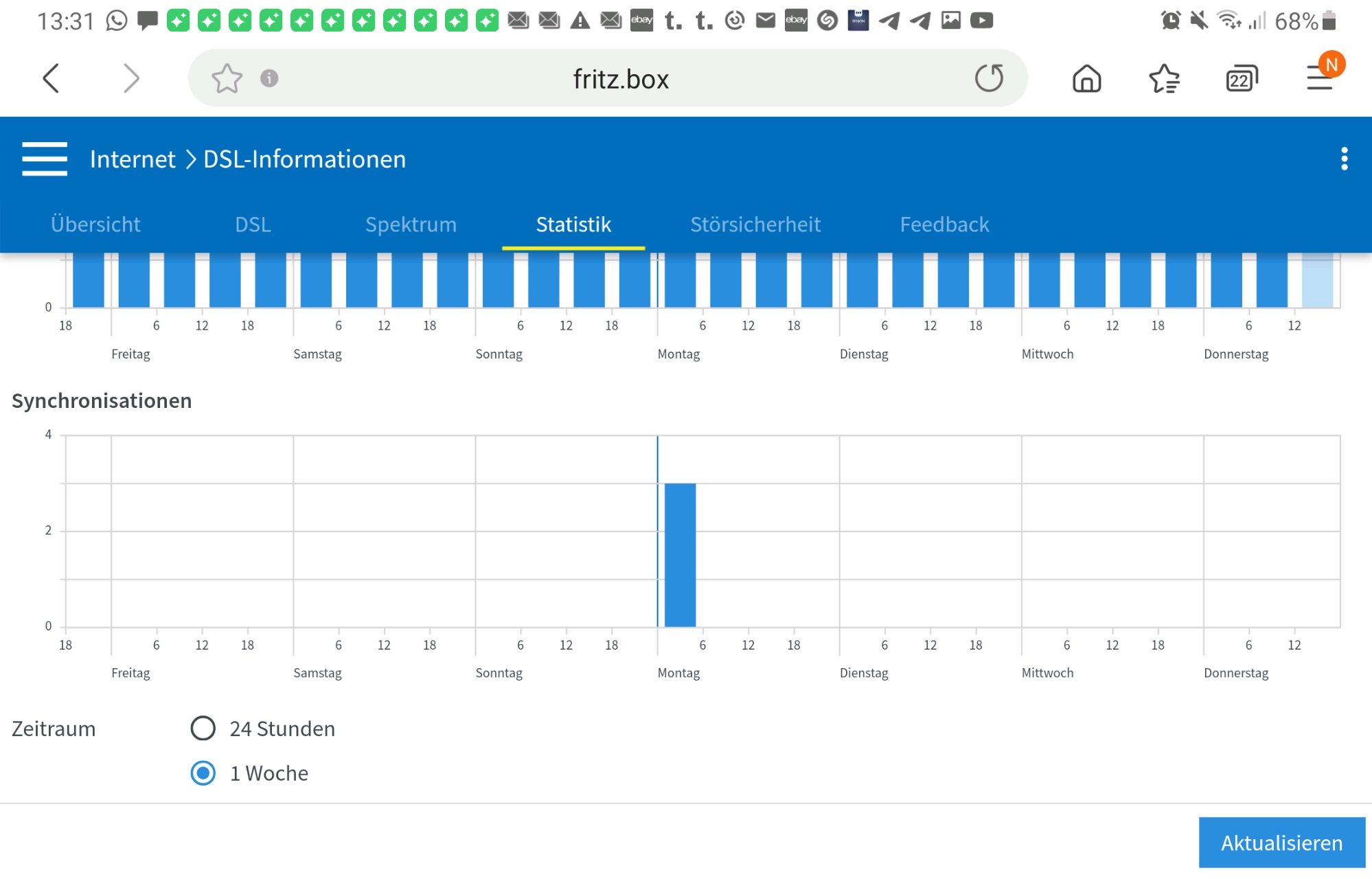 Beim Download sind es dann wenn ich mir im Browser den Download ansehe statt 1 - 1,5 mb/s nur noch 0,1 - 0,2 mb/s. Für wie lange das immer anhält kann ich nicht sagen. Weiß aber mit Sicherheit dass in Nacht eigentlich keine Probleme vorliegen. Tagsüber immer so im Wechsel.
