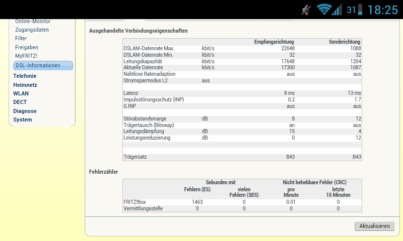 Man sieht das die Fritzbox sich mit maximal 22048 kbit/s Verbinden könnte.