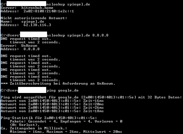 die ipv4 8.8.8.8 ergibt keine antwort, aber die ipv6 2a00:usw funktioniert