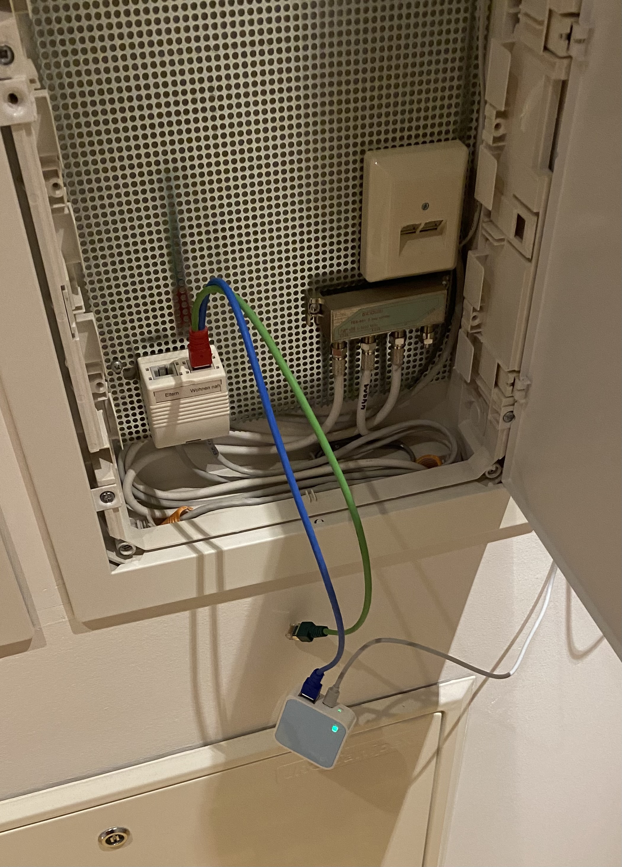 Ich habe versucht, das Internetsignal vom Wohnzimmer (wo mein Modem ist) in mein Schlafzimmer zu bekommen, um dort einen Access Point anzuschliessen. Dafür habe ich das Modem im Wohnzimmer via Ethernet mit der Zentrale verbunden, und von da weiter zum Schlafzimmer (überbrücken der beschrifteten Buchsen mit LAN-Kabel).