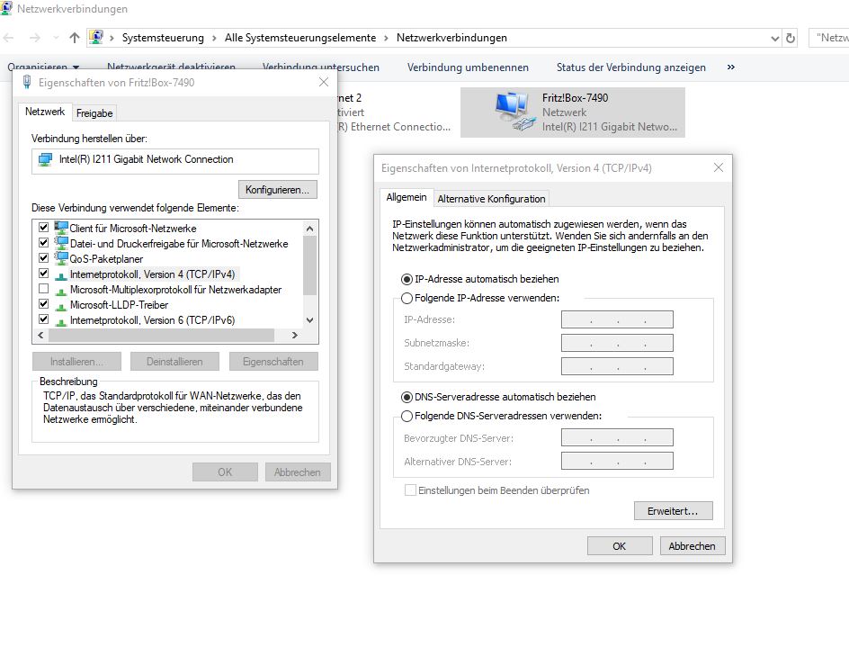 Systemsteuerung->Netzwerk und Freigabeoptionen-> oben links "Adapter-Einstellungen ändern" wählen -> den entsprechenden Adapter wählen mit rechts drauf klicken und Eigenschaften wählen -> dann auf Internetprotokoll Version 4 gehen und rechts unten "Eigenschaften" wählen. Gleiches kann man mit dem Protokoll Version 6 prüfen.