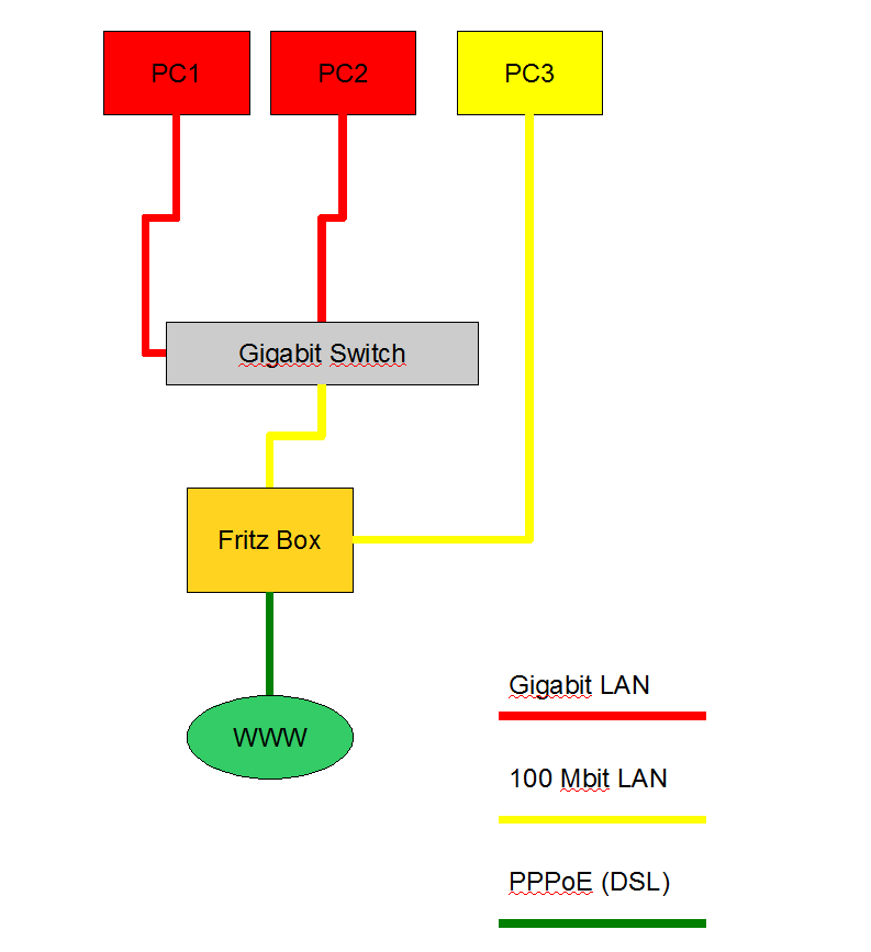 Mit am Switch hängt die FritzBox, die allerdings nur eine 100Mbit Schnittstelle hat.