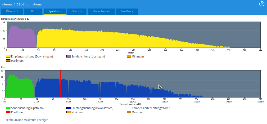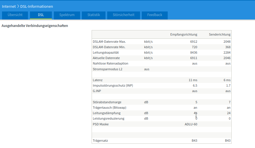 (Aus dem Menüpunkt Internet -> DSL-Informationen sind also die drei Tabs "Übersiicht", "DSL", "Spektrum" von Interesse.)