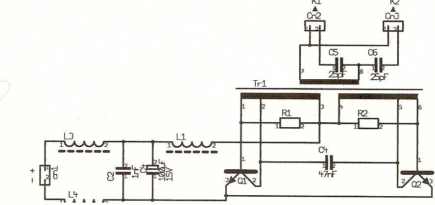So, und das ist die Schaltung von besagtem Teil. Q1 ist abgeschossen. Aber im Zuge der Gleichmäßigkeit beider Transistoren werden beide gegen je einen BC184b ausgetauscht. Und damit nicht noch mal was passiert kommt vor L3 eine Diode.