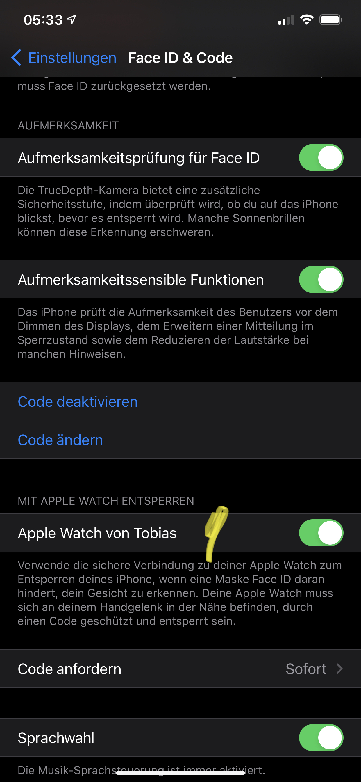 [...] ziert ne entsperrte Watch dein Handgelenk, dann das iPhone ganz klassisch via Face-ID entsperren, Watch gibt die entsperrung frei und macht brum brum, System offen. Das hebt aber nicht die FaceID Sperre bei ApplePay auf, hier bleibt nur die PIN oder die Watch nutzen. [...] aktiviert wird die ganze Show hier: [...] Anhang anzeigen 1072736