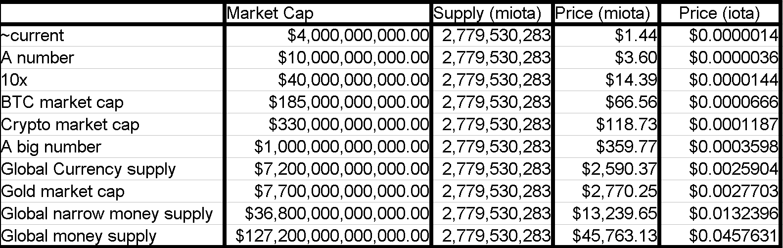 Hier noch ein kleines Übersichtschart zur IOTA Preisentwicklung aus dem IOTA Slack. Zeigt im Endeffekt wie viel Geld in IOTA fließen müsste, damit 1 MIOTA soundsoviel wert wird. Die Marketcapangabe stimmt aber schon nicht mehr. Die hat sich in den letzten 3-4 Wochen schon verdoppelt.