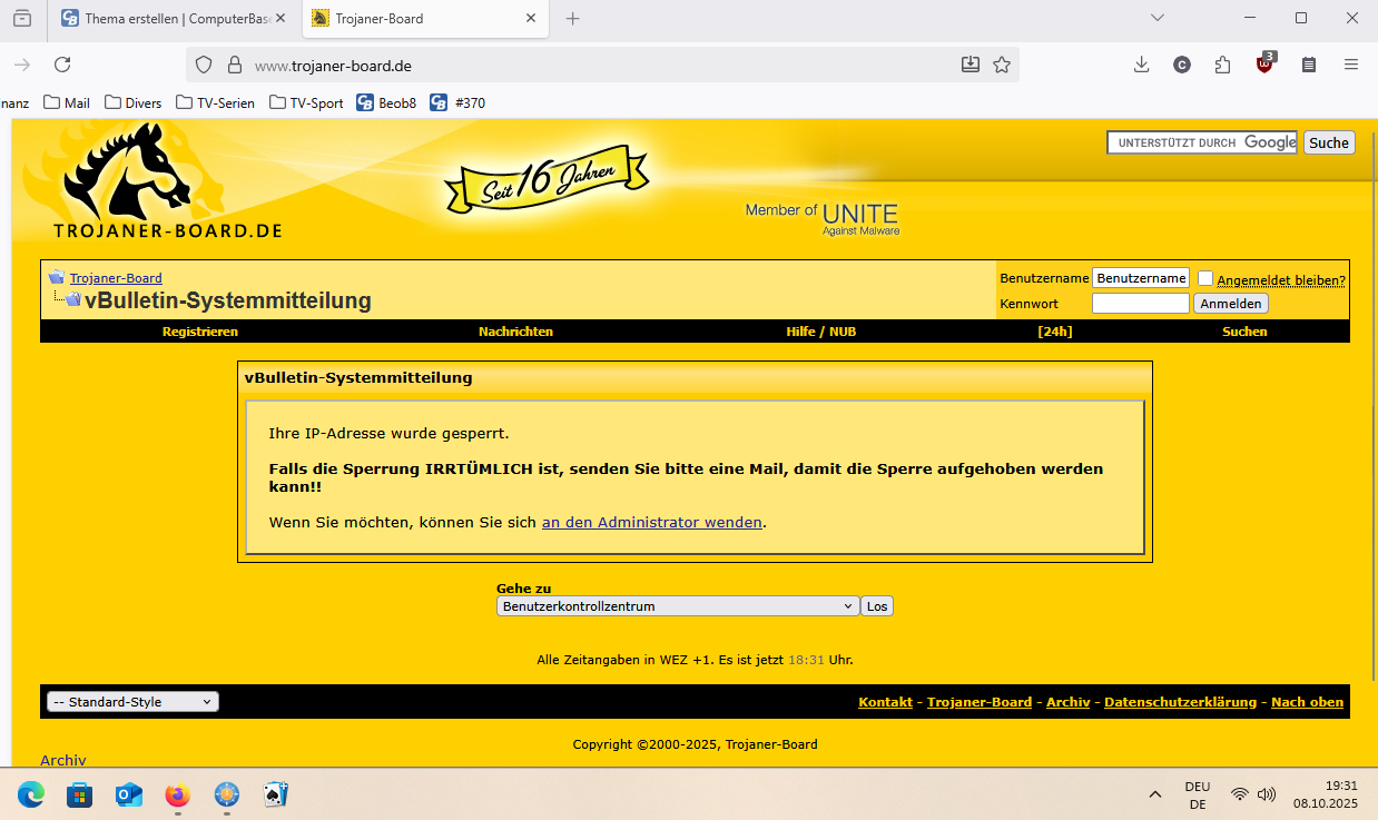 Meine IP Adresse bei Trojaner-Board.de ist gesperrt.